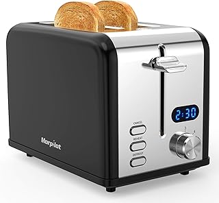 Morpilot Grille Pain Noir et Inox Toaster Grilles Pain 2 Fentes Larges avec Chauffe Viennoiserie, Affichage LED, 6 Niveaux de Brunissage, Plateau à Miettes, Decongelation / Réchauffage / Annulation