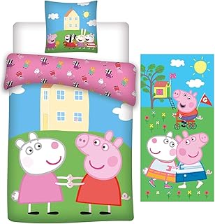 rainbowFUN.de Peppa Pig Parure de lit réversible pour enfant avec housse de couette 135 x 200 cm, taie d'oreiller 80 x 80 cm, serviette 70 x 140 cm, 100 % coton