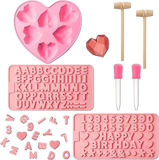 Moules de Coeur Diamant Moules à Chocolat en Silicone 2 Moules à Chocolat de Lettre Nombre 2 Marteaux en Bois 2 Compte-Gouttes pour Dessert Gâteau Fondant Mariage Saint Valentin (Rose)